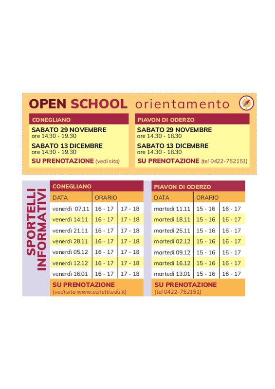 Qualora gli studenti fossero interessati a conoscere meglio la nostra scuola, possono visitare la sezione Orientamento del nostro sito (https://cerletti.edu.it/servizio/orientamento/), dove troveranno informazioni dettagliate sulla nostra Offerta Formativa e sulle attività di accoglienza. In particolare, segnaliamo le giornate di OPEN DAY il 29 novembre 2025 e 13 dicembre 2025, oltre agli sportelli informativi previsti per i venerdì pomeriggio: queste occasioni offriranno agli studenti e alle loro famiglie un'opportunità diretta di dialogo con i docenti e di approfondimento della realtà scolastica, utile per orientarsi nella scelta del percorso.